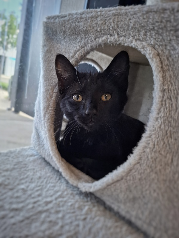 With my striking black coat and bright, curious eyes, I'm hard to miss - but it's my sweet and playful nature that really makes me shine!