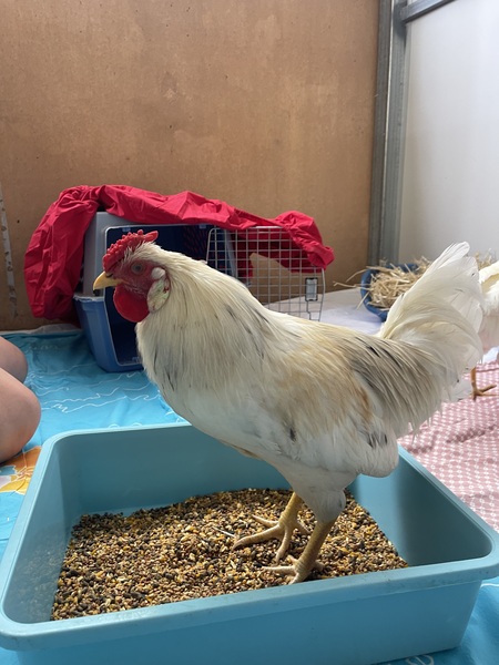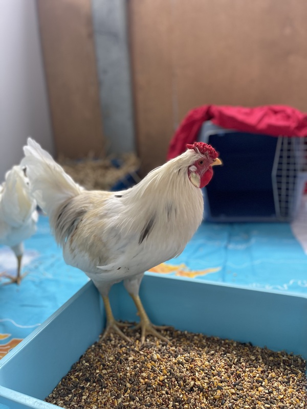 Rico is a dazzling Polish Bantam white rooster with a fabulous feathered crest and a confident sparkle in his eye. While he may start off a little shy, Rico is noticeably more comfortable around people than his buddy Rufus, and he's always curious about what you're up to.