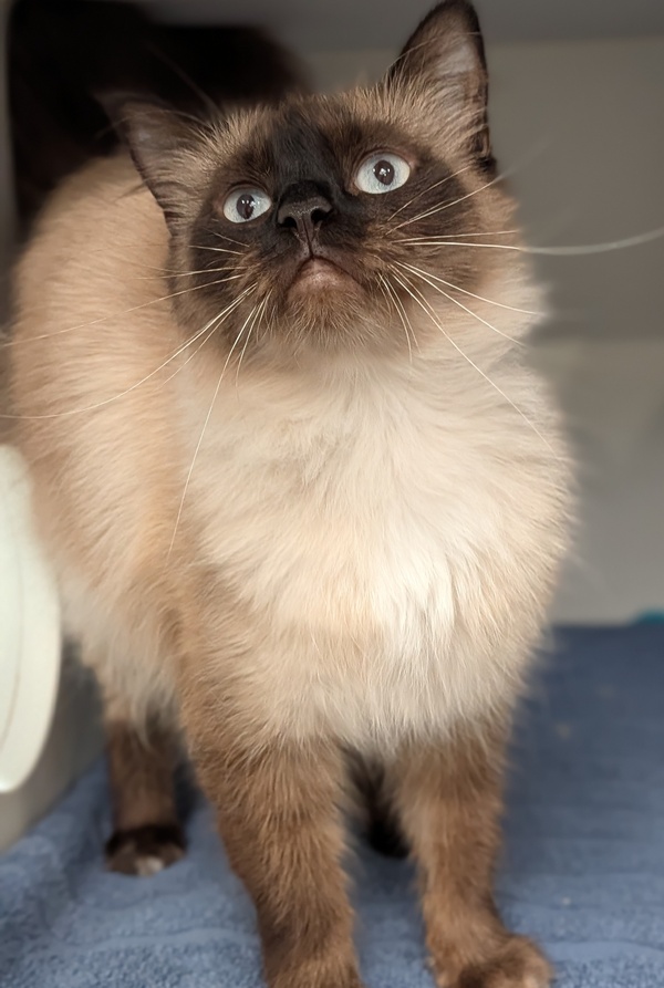 Snickerdoodle is a sweet little gentleman with a heart as soft as his fur. At first, he might seem a bit shy, but give him a sprinkle of patience and you'll discover a cuddle bug in disguise! Once he feels safe, Snickerdoodle blossoms into a loving companion who adores quiet snuggles and gentle pats. His purrs are soft and soothing, and his quirky whiskers add charm to his already irresistible personality. He's the kind of cat who'll curl up beside you during a cozy movie night or keep you company while you read. Snickerdoodle would thrive in a calm, loving home where he can take his time to settle in and show off his affectionate side.