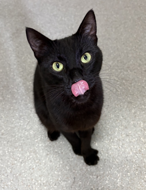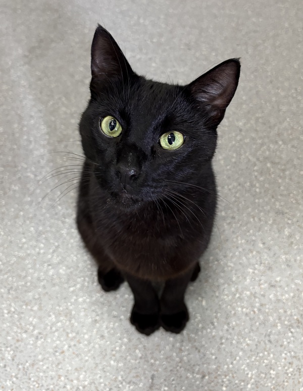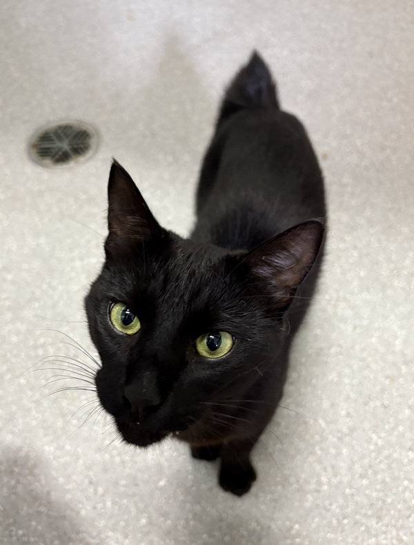 I'm a striking black cat with a look you won't forget-long, tall, and elegant like my Oriental roots, with a cute little bobtail that makes me extra special. My glossy coat shines like midnight, and my bright eyes are always searching for the next adventure. π