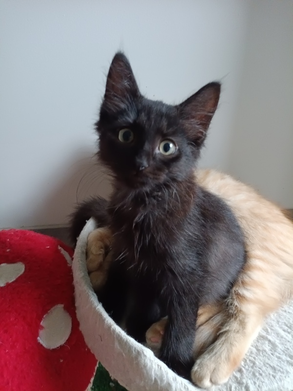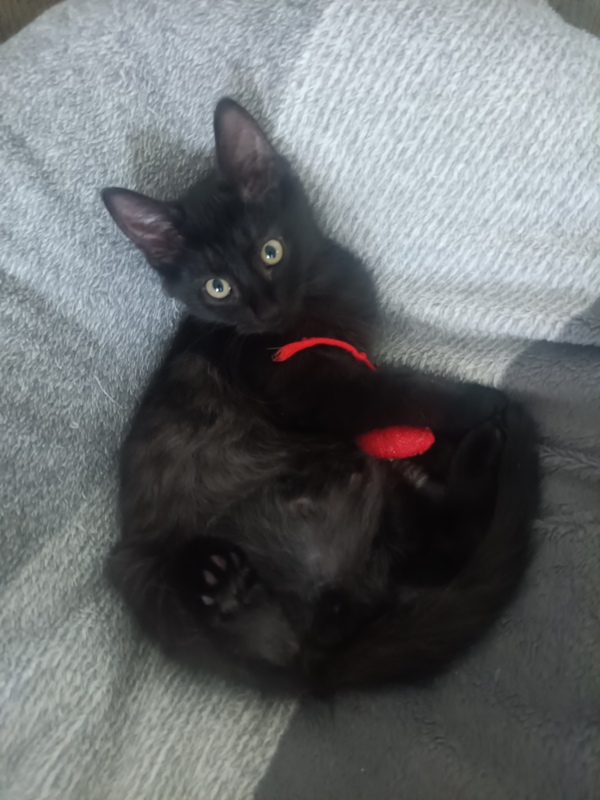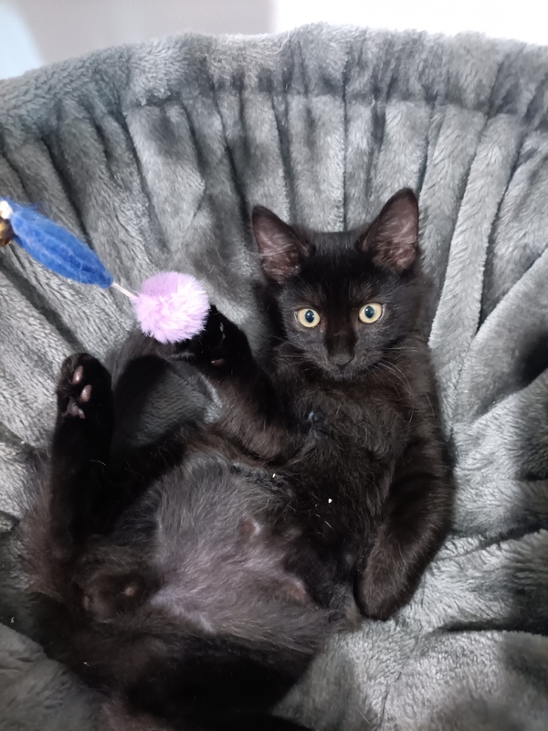 At just 12 weeks old, I've already discovered that I'm destined for greatness. Some kittens dream of being athletes... but me? I'm aiming to become a stealth ninja superstar. With my shiny black coat and silent paws, I'm an expert at sneaking, pouncing, and appearing out of nowhere with perfect kitten timing. Don't worry-it's all in good fun. I'm playful, cheeky, and always ready to turn anything into a game.