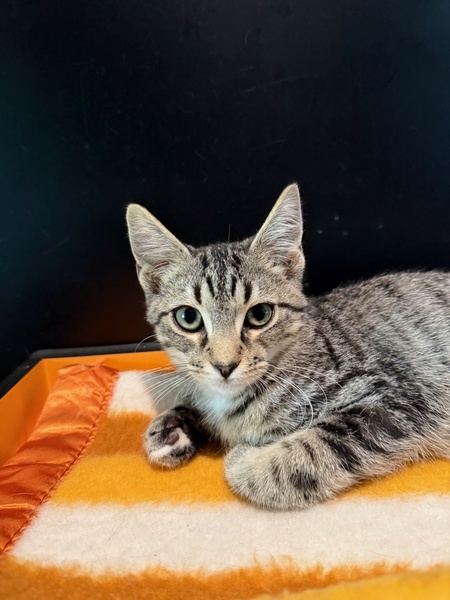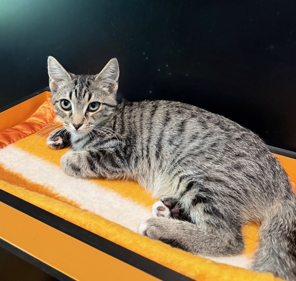 Cosmo is a young brown tabby male kitten who started life a bit unsure of the world. He's still getting used to people, but with patience and kindness he's slowly showing his sweet, gentle nature.
