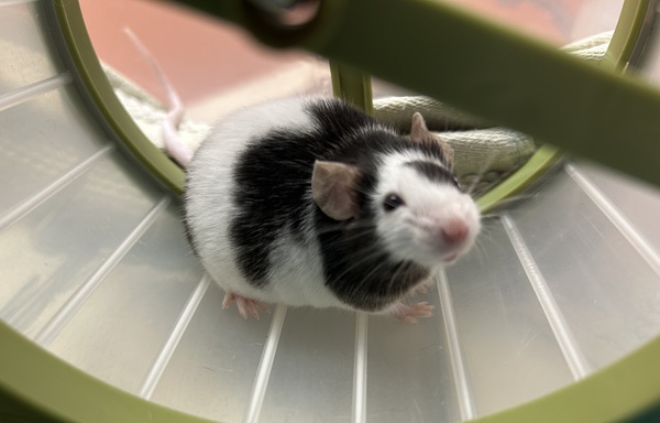 Meet Nimbus, a male Mouse with a white and black coat. Mice are relatively easy to care for, requiring daily feedings and weekly habitat cleanings. Did you know that mice make great, interactive pets? Like any animal, the more positive human interaction they experience, the more comfortable they will be around us. Although mice don't need long walks like dogs, or giant scratching towers around the house like cats, they still require physical exercise and mental stimulation to keep them happy and healthy, just on a smaller scale. You can get creative with your toilet paper rolls, tissue and cereal boxes to make fun new hidey holes and tunnels for your mice to explore. Twigs and branches also make great enrichment toys. Mice require a constant supply of high quality rodent mix as well as fresh fruit and veggies. Our male mice are generally adopted in pairs, as they do enjoy the company of their own species.